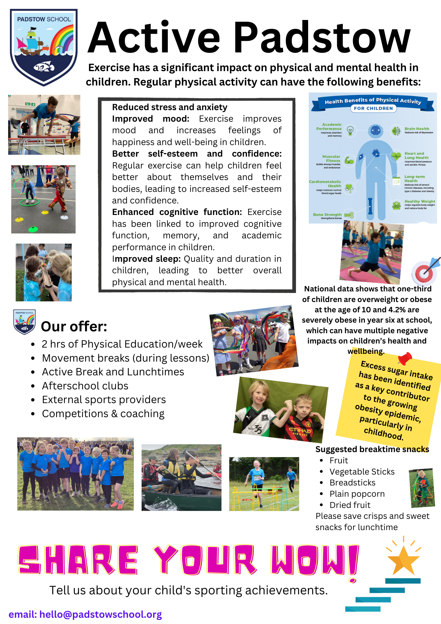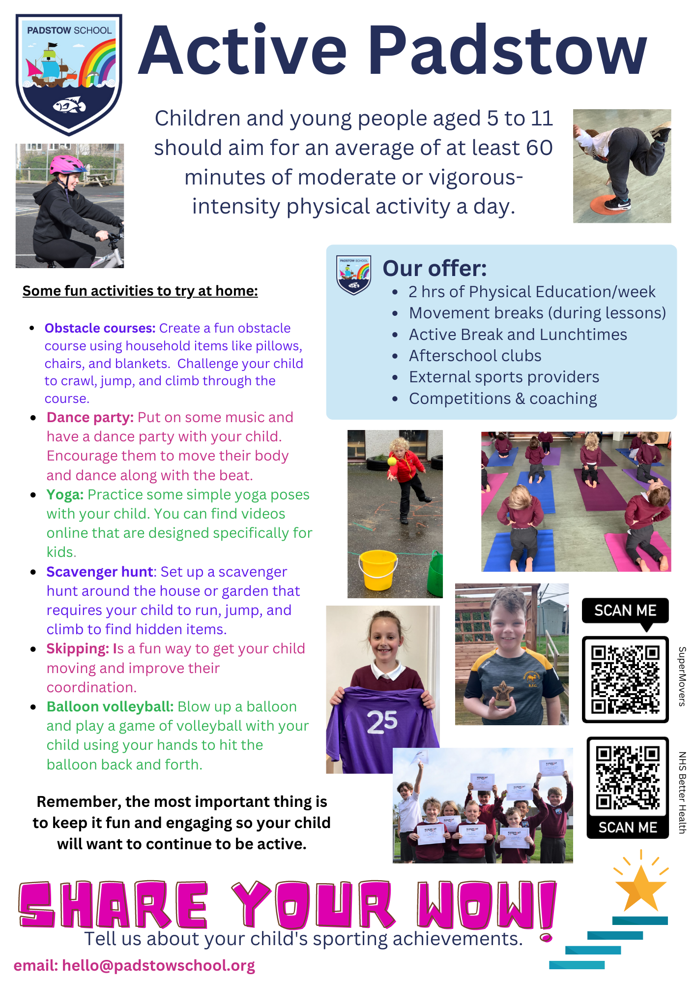 We aspire for children to adopt a positive Growth Mindset and believe that anything can be achieved with determination and resilience. At Padstow, we offer a dynamic and varied program of activity to ensure that all children progress physically through a fully inclusive PE curriculum. Our curriculum aims to improve the well-being and fitness of all children, not only through the sporting skills taught, but through the underpinning values and disciplines PE promotes. We aim to deliver high quality teaching and learning opportunities that enable all children to achieve their personal best.